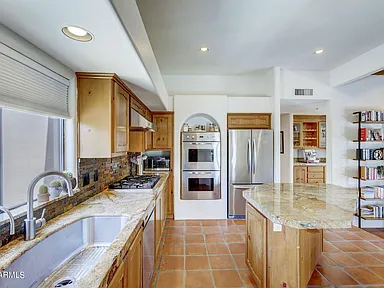 The heart of the home is its upgraded chef’s kitchen, featuring a gas range, wall oven, and an inviting island that’s perfect for entertaining. The highlight? Multi-sliding pocket doors that seamlessly blend indoor and outdoor spaces, letting you embrace the true essence of Arizona-style living.