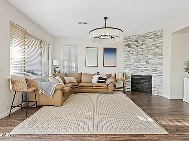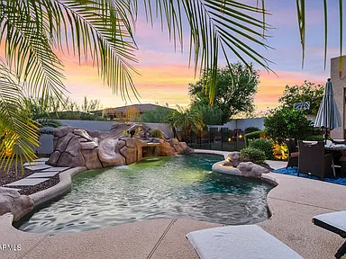 Step outside to your private oasis, featuring low-maintenance artificial turf, a sparkling PebbleTec pool, and a custom rock feature with a water slide—perfect for enjoying Scottsdale’s sunny days.